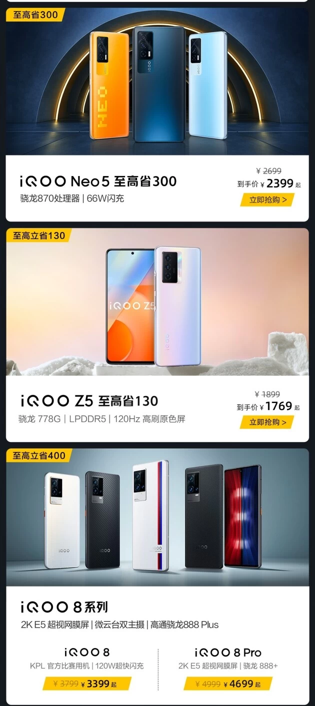 在此次活动期间,iQOO 8系列、iQOO Neo5、iQOO Z5和iQOO Z5x在内多款iQOO手机以及多款原装配件也将推出优惠活动,用户下单即可享受相应的优惠政策。