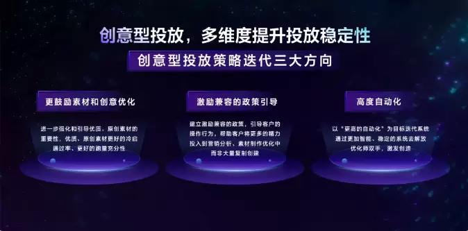 随着创意、素材在投放中的作用越发重要,未来,巨量引擎将打造“创意型投放”,以创意为核心,并制定奖惩机制,激励原创、优秀素材的创作与投放,让优秀的创意得到更充分的跑量和回报,推动系统的流量分配效率改善、形成良性循环生态。