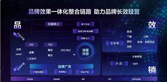 品效协同方面,巨量引擎基于企业号、品牌号阵地和任务玩法等,打通“品+效+销”营销场景,前链路优化品牌流量产品样式及投放策略,提升点击率;在后链路强化号内建设,提升互动涨粉、内容沉淀以及商品转化,闭环“品牌-互动-转化-经营”链路。