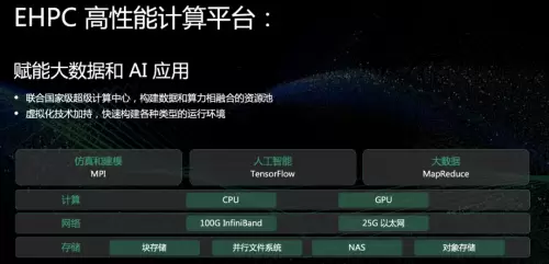 青云QingCloud EHPC可以全面支持各种新的业务场景。对于超算最常见的仿真和建模业务,青云提供了低延时、高带宽的InfiniBand网络,高速并行文件存储以及CPU/GPU的算力组合,不仅能支持大规模求解运算,还能提供GPU桌面进行图形前后处理,从而完成一个闭环的业务场景。对于人工智能训练业务,青云提供算力达850PFlops的A100 GPU资源池和全闪并行文件存储,并且能够结合容器平台,提供性能极致优化、轻量便捷、开源开放的人工智能平台。