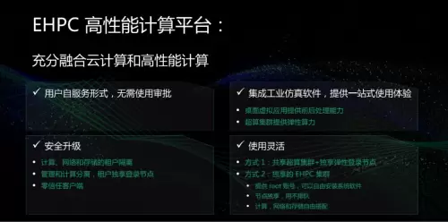 QingCloud EHPC可以提供超算的自服务,是因为用云计算技术保证了平台的安全,主要表现在以下三个方面:第一,计算、网络与存储的租户在物理和逻辑上实现了强隔离;第二,青云云平台的管理节点与计算节点分离,租户可以使用完全独享的登录节点;第三,除了传统的VPN接入,青云还提供零信任客户端,让用户登录到超算中心的时候更便捷和安全。
