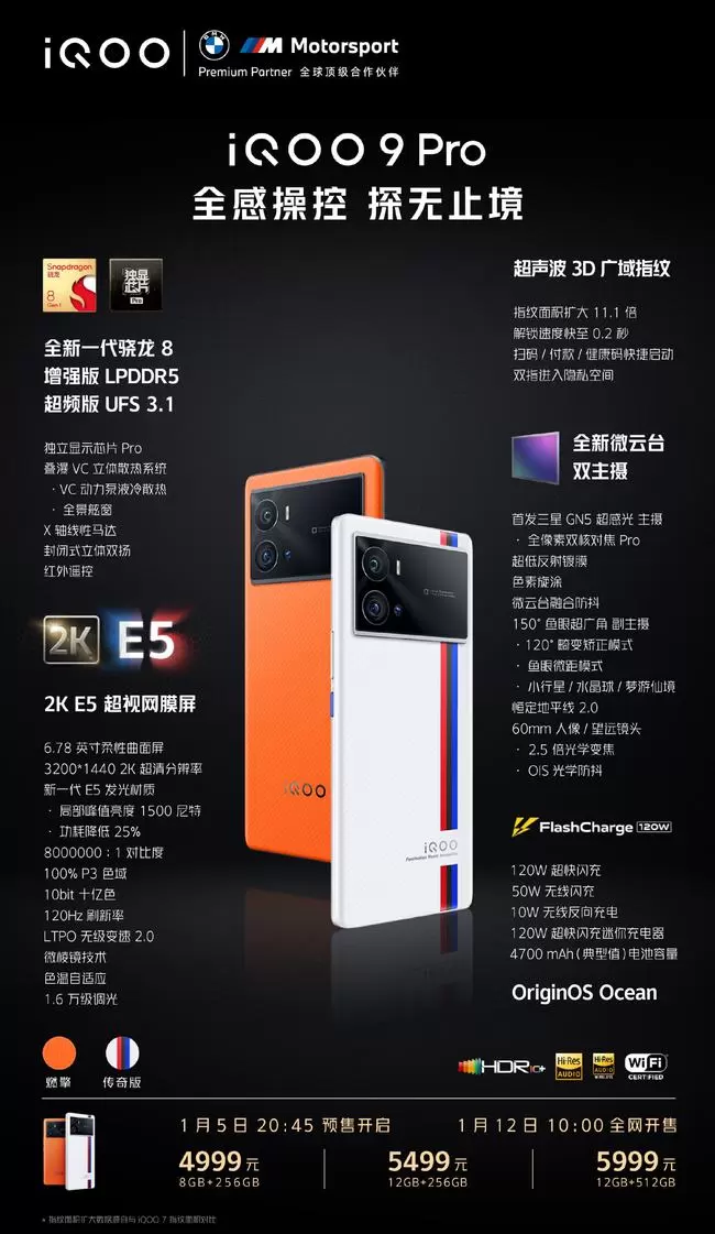 iQOO 9 Pro的实力更加全面,也更加均衡。这款新机拥有安卓阵营顶级的视效表现,正面搭载一块 6.78 英寸 柔性曲面屏,这块行业最强2K E5曲面屏支持 2K 超清分辨率、120Hz 刷新率以及10bit色彩深度,同时搭载 LTPO 无级变速 2.0,共同实现了顶级视效以及优秀的屏幕能耗控制。该机同时还搭载了超声波 3D 广域指纹技术,支持指纹快捷启动功能,在指纹解锁便捷度、安全性方面有了极大提升。该机的性能实力同样出众,除了全新一代骁龙8、超频版 UFS 3.1等常规硬件的升级外,新机还搭载独显芯片Pro,从视效、帧率等方面提升着游戏体验。新机还首发搭载了三星 GN5 传感器,并迎来微云台2.0的加持,交出了旗舰水准的专业影像表现。