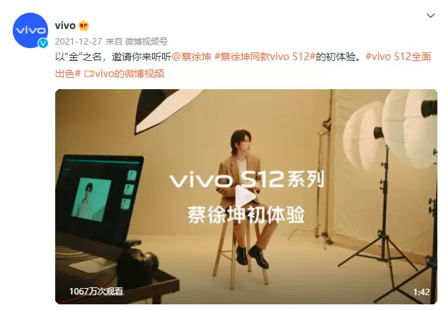此前,vivo官方微博也分享了代言人蔡徐坤上手vivo S12系列的初体验。在视频中,蔡徐坤分享了vivo S12系列在影像、性能两大方面的体验,并与粉丝交流了使用的心得和经验,表示“拍照功能更聚焦人物本身的质感”,更选择了“暖金”作为其最喜爱的配色。