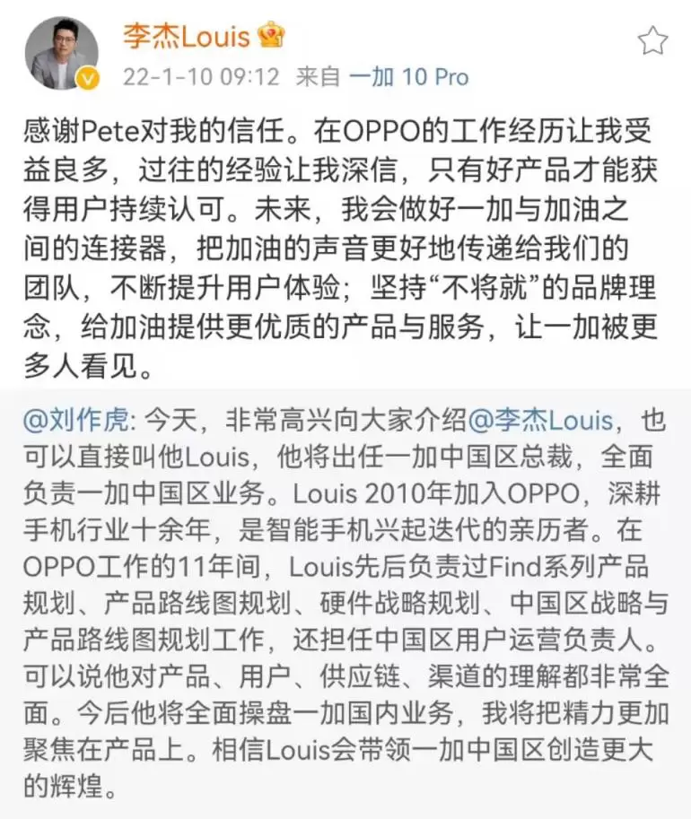 1月10日,一加创始人刘作虎通过微博宣布,李杰将担任一加中国区总裁,全面负责中国区业务,自己将更专注于产品研发。随后,李杰转发微博表示,自己要做好一加与用户之间的“连接器”,把加油的声音更好地传递给团队,不断提升用户体验,坚持“不将就”的品牌理念,给加油提供更优质的产品与服务,让一加被更多人看见。