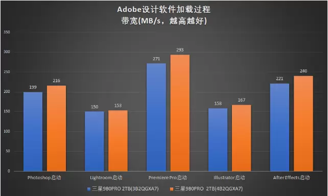 通过对比来看,4B2QGXA7的综合性能更强。导出并分析PCMark 10完整系统盘基准测试成绩,新固件在开启软件时响应速度更快: