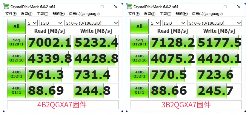 对比3B2QGXA7和4B2QGXA7两版固件可以发现,新固件的顺序读取速度略有下滑,但4K随机读写IOPS得到显著增强。
