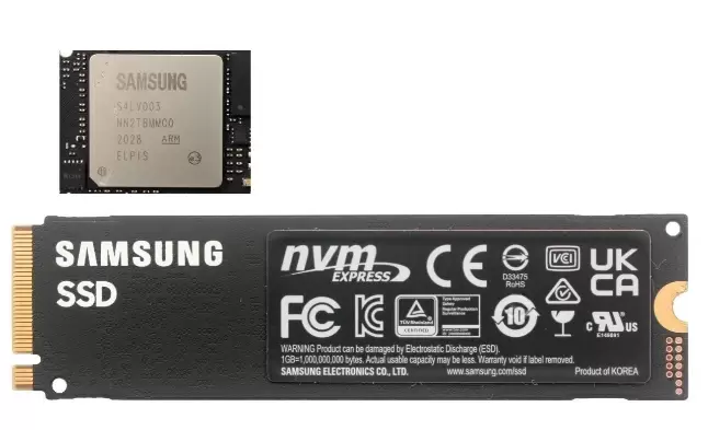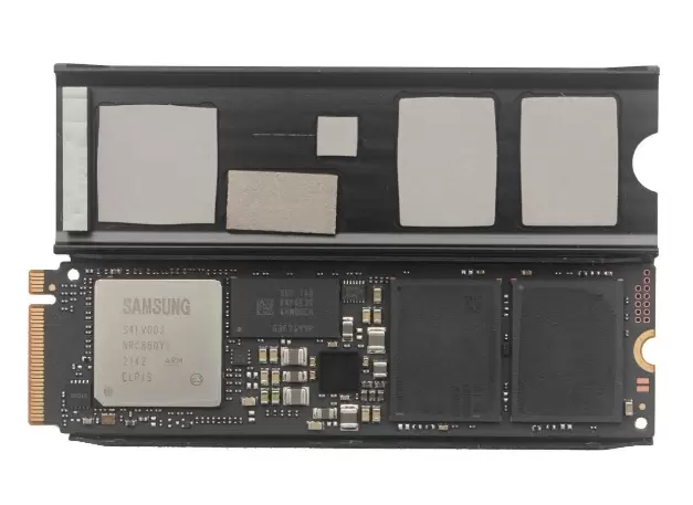 拆卸散热片后可以看到,三星在主控、闪存、DRAM缓存以及电源管理芯片上方都布置了独立的导热垫。在靠近M.2接口的位置还有平衡垫高处理,确保了所有导热垫都能和芯片紧密接触。ELPIS主控依然使用镀镍处理,能够增强散热能力。