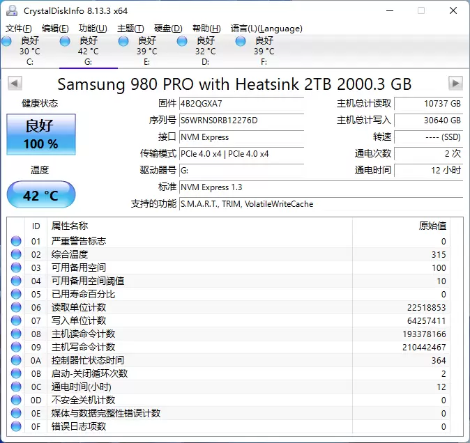 CrystalDiskInfo能够识别NVMe固态硬盘的传输模式和标准SMART健康信息,但对于APST节能、Maximum Payload Size这类信息则需要使用smartmontools和HWiNFO64进行识别。