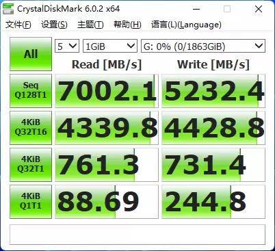 理论带宽测试的目的是为了快速验证固态硬盘是否能达到它标称的性能指标,这里使用CrystalDiskMark 6.0.2,将顺序读写测试改为队列深度128,随机读写测试改为16个测试线程,队列深度32。三星980PRO with Heatsink 2TB的实测顺序读写性能为7000.2/5232.4 MB/s,4K随机读写4339.8/4428.8 MB/s,可换算为1084950/1107200 IOPS,均达到并超过标称值。