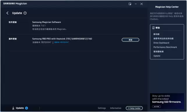 我们测试的这款980PRO散热片版2021年11月出厂,搭载3B2QGXA7固件,近期三星为980PRO提供了4B2QGXA7更新,可以通过三星魔术师管理软件进行升级。我们将在下面的测试中对比两版固件之间的变化。