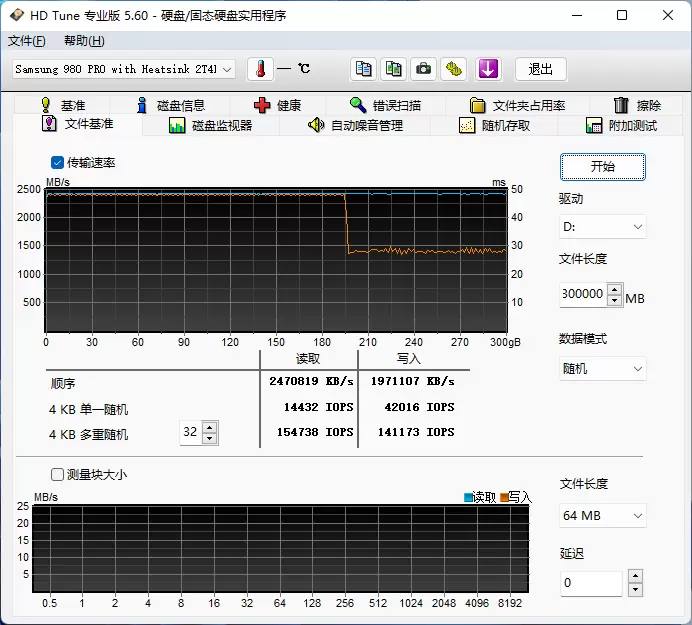 利用IOMeter向盘内填充932GB的不可压缩数据后,HDTune文件基准测试显示,三星980PRO 2TB散热片版依然具备大约225GB的写入缓存。