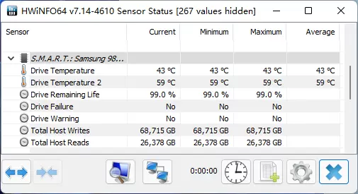 以下测试均在在室温25度条件下进行。三星980PRO散热片板可以提供两个温度读数,默认显示的综合温度比较接近闪存温度,需要通过HWiNFO64或其他测试软件检测的温度2则是主控温度。
