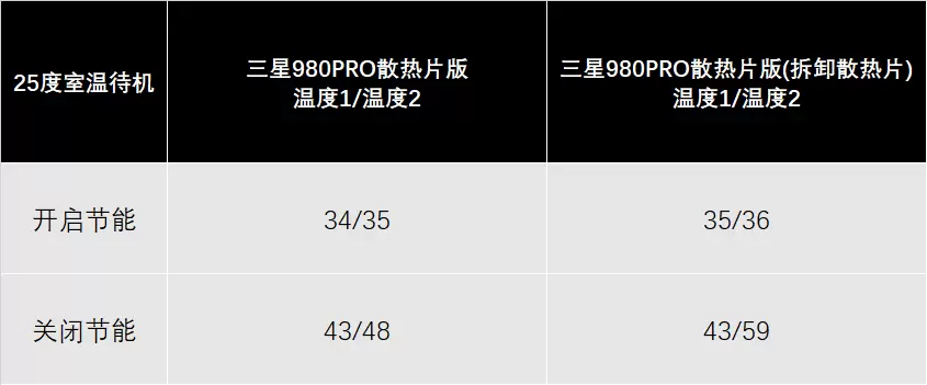 在带有散热片的情况下,三星980PRO散热片板无论是否开启节能特性,待机温度都很低,说明主控发热量控制出色。在关闭节能特性的情况下,散热片可以为SSD主控降温11度左右。