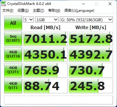CrystalDiskMark半盘测试结果同空盘时相比基本不变: