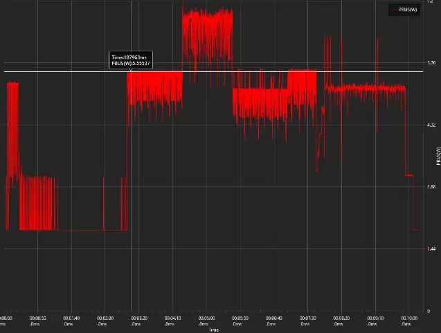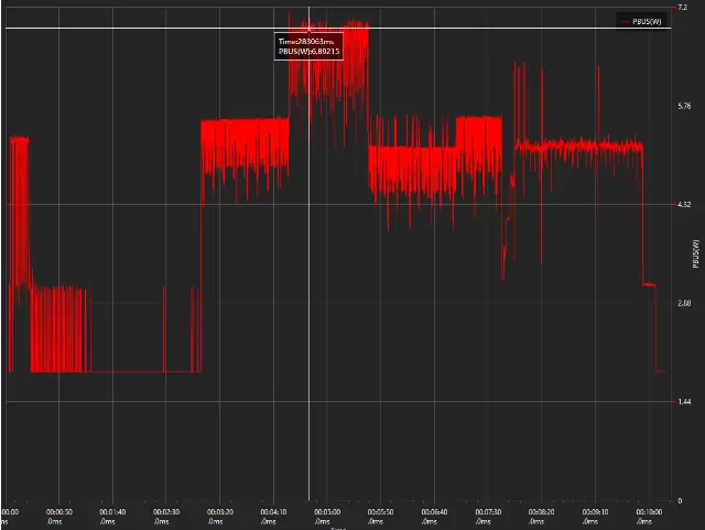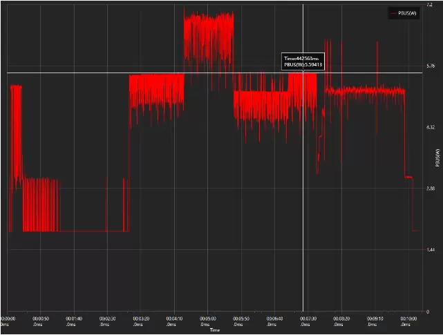 分析不同测试阶段的功耗信息:HDTune写入测试过程,在SLC缓存内时功耗约为5.56瓦。