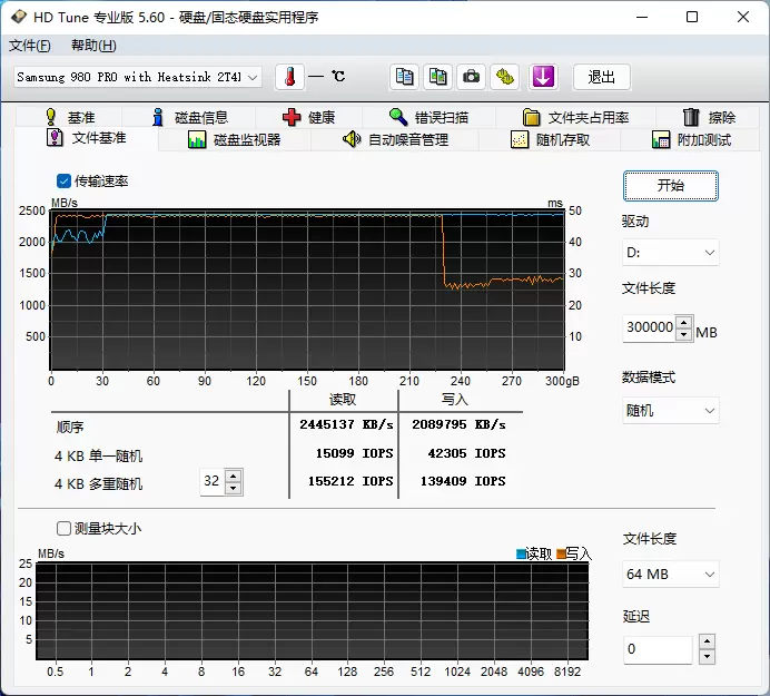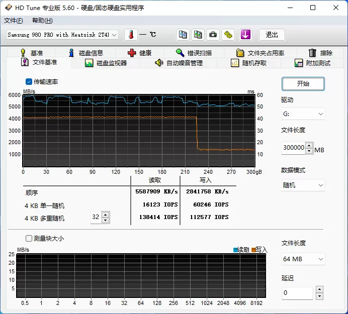 三星980PRO使用了全新的TurboWrite 2.0智能SLC缓存算法,可用写入缓存容量相比过去提升5倍。HDTune文件基准提供了一个SLC缓存容量的简易测定方法,确认了空盘状态下980PRO 2TB散热片版拥有大约225GB的写入缓存。由于测试方法的原因,HDTune文件基准测得的读写速度可能与理论最大带宽有一定差距(队列深度不够)。
