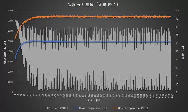 温度压力测试是在关闭所有节能特性、25度室温的条件下进行,同样是分为有/无散热片进行测试。首先来看拆除散热片后的三星980PRO with Heatsink:满载测试开始仅6秒,主控温度达到70度,随即开始出现限速动作。整个测试过程中主控温度最高达到94度,而闪存温度仅有62度。主控温度限制了性能的进一步发挥。