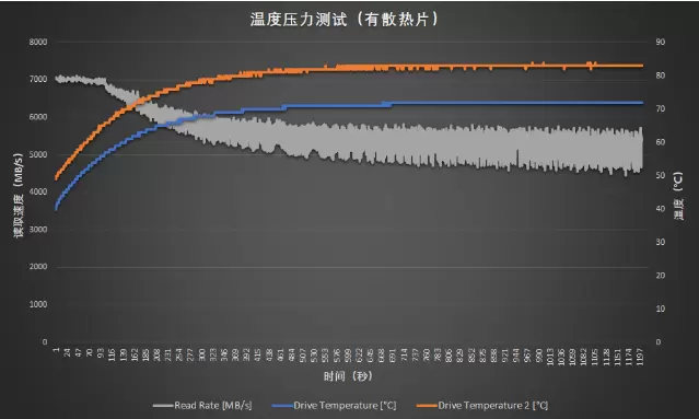 接下来是默认带有散热片的三星980PRO with Heatsink:依然是主控过热诱发限速,不过这一次速度控制更加平滑,一直到140秒之后主控温度达到70度,方才有比较明显的限速动作。满载测试持续进行了20分钟,读取速度依然保持在5200MB/s左右,相比无散热片的情况,性能得到了更多地释放。