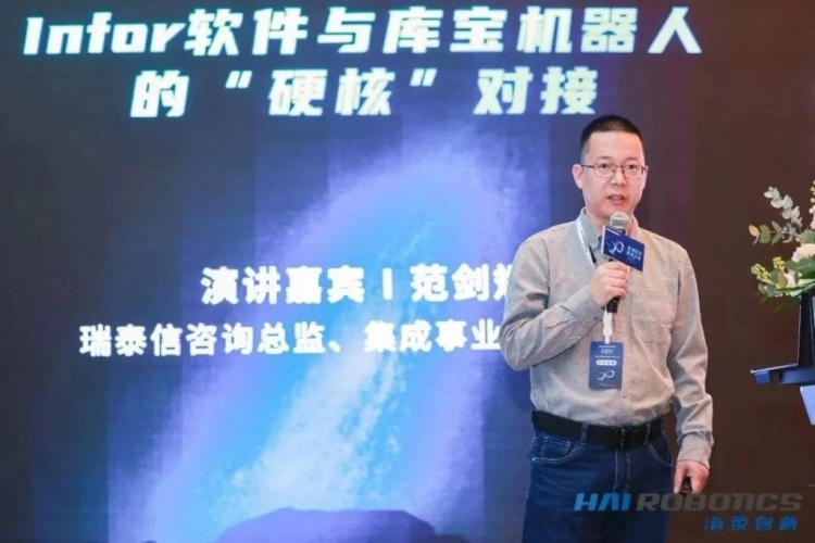 瑞泰信咨询总监范剑斌在《infor 软件与库宝机器人的 " 硬核 " 对接》演讲中介绍,瑞泰信作为智慧供应链一体化服务商,在与海柔创新的项目合作中,取得了高度的配合,密切的协同作战,为客户的仓库智能升级,实现了最大化的效能提升。