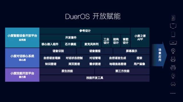 DuerOS的开放是全方位的。根据景鲲的介绍,DuerOS向开发者开放的能力包括三个层面:技能开放平台(能力层)、对话核心系统(核心层)、设备开放平台(应用层)。