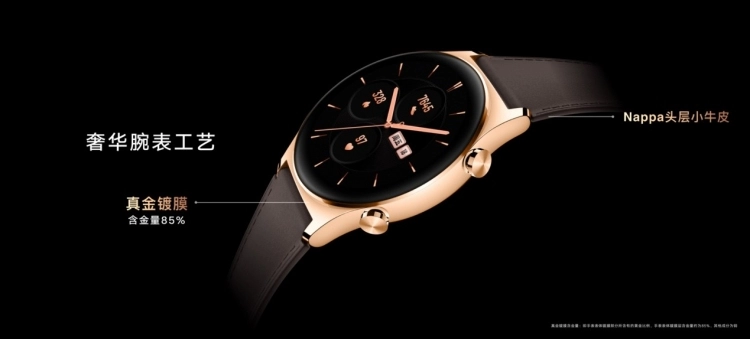 在表带设计上,荣耀手表GS 3精选毛孔细小、触感细腻的Nappa头层小牛皮表带,佩戴更加舒适亲肤。同时在工艺设计上,流光经典款表身还采用了更高难度的真金镀膜工艺,镀膜含金量高达85%,使得手表外观更加绚丽典雅,致力给用户带来高端腕表的奢华美感和极致的佩戴体验。