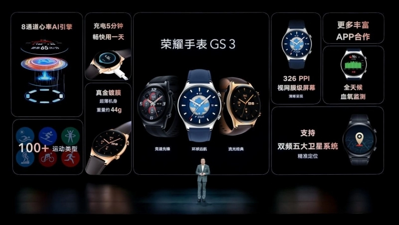2022年1月10日荣耀Magic V旗舰新品发布会上,备受期待的高端旗舰智能手表荣耀手表GS 3惊喜再现,完美展现了高端时尚与先锋科技的结合,从健康监测、工艺设计、运动管理、续航能力、便捷体验等层面实现全方位的技术进阶,树立全能型智能穿戴行业新标杆。