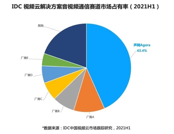 近日,国际数据公司(IDC)正式发布《中国视频云市场跟踪(2021上半年)》报告(以下简称“报告”)。根据IDC数据,作为行业的开创者,声网Agora 在音视频通信(RTC)场景继续蝉联市场份额第一,2021年上半年份额甚至超过了第2-8位总和。