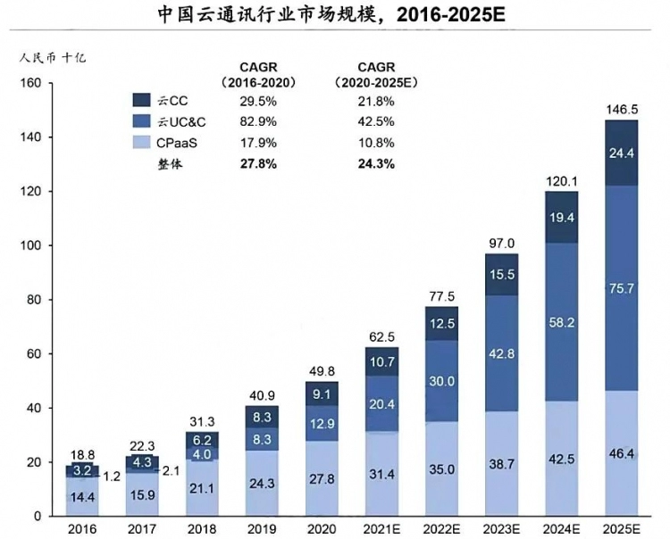 根据CIC灼识咨询的《中国云通讯行业蓝皮书》报告,中国云通讯行业快速增长,整体市场规模将从2020年的498亿元,增长至2025年的1465亿元。