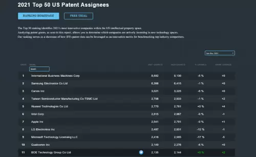 BOE(京东方)位列2021 IFI专利授权排行榜全球第11位
