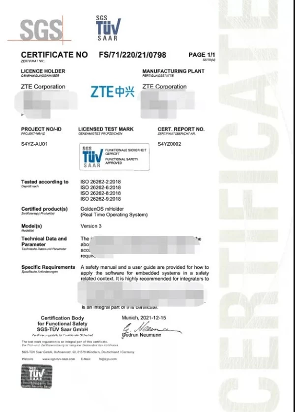 SGS为中兴通讯汽车操作系统GoldenOS微内核产品颁发ISO 26262:2018汽车功能安全产品认证证书