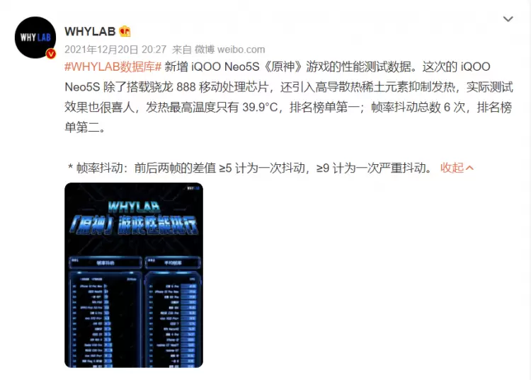 看到骁龙888芯片后,很多人都会担心iQOO Neo5S的发热情况。为了控制温升,该机采用了高导稀土散热系统,根据科技博主@WHYLAB的测试,在运行《原神》时,该机的后盖最高温度只有39.9°C。实际上,在加入稀土元素后,该散热系统的导热性能实现了翻倍提升,能带来更高效的散热,用户基本不用担心iQOO Neo5S会出现机身过烫的问题。