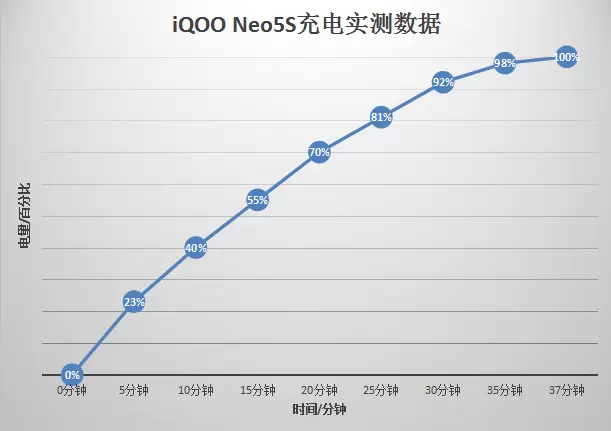 现在很多人都想要续航时间久、充电快速的手机,而iQOO Neo5S正是这样的手机。它的电池容量为4500mAh,并且采用的是双电芯设计,配合上66W闪充技术,能够实现更快的“回血”速度。在测试中,该机完全充满电只需要37分钟,这在同价位机型中算是很快的充电速度了。日常使用时,很多人都会在手机还剩余部分电量的情况下进行充电,这时手机充满电所耗费的时间会更少,因此iQOO Neo5S完全可以满足用户想要手机快速“回血”的需求。