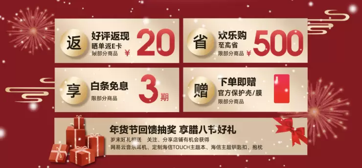 悦读年货节期间,大家在海信手机京东自营旗舰店可以享受欢乐购至高省500元、好评返现、白条免息等优惠福利,参与抽奖还有机会获得音乐耳机、定制主题本、海信主题钥匙扣、抱枕等好礼。人气爆款海信TOUCH音乐阅读器,年货节特价低至1549元,错过等一年!
