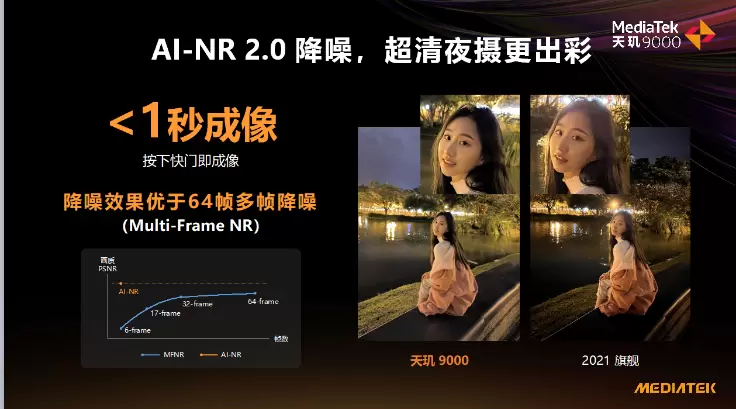 AI-NR 2.0降噪可将夜景拍摄成像速度压缩至1秒以内,用AI算法来进行夜景降噪处理,效果还优于传统64帧多帧降噪的效果,真正做到了又快又好,可谓是更聪明的“夜视仪” ,暗光也清晰。
