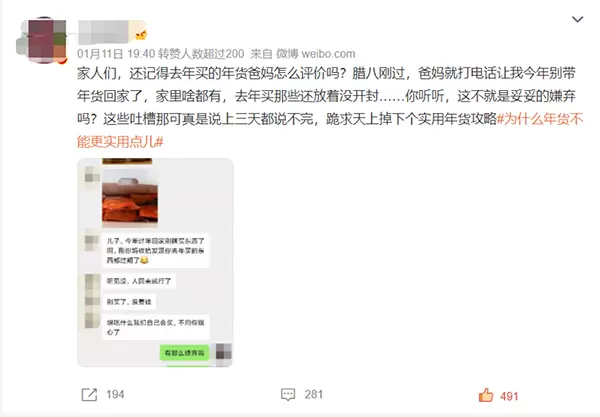 “今年回来啥也别买了”、“你之前买的土特产都快过期了”……临近春节,多少人已经被给爸妈买年货的事情整emo了?微博上#为什么年货不能更实用点儿#的话题引发了网友们的讨论。同一个世界同一种爸妈,一年到头回趟家,想买点年货的心意很好,可是想给爸妈买点更实用的年货,应该怎么选?