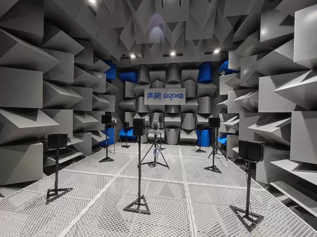 为了满足各场景下对于音频和音效研究、测试、评估的新高度,并提升效率。声网投入大量资源,打造了全球第一个全自动多场景模拟声学实验室,并于2021年10月正式启用,它的出现代表着RTE行业在多场景实时互动下第一个专业的测试设施和测试环境的建设已经成功投产,将为未来多场景下的音频和音效研究、测试、评估带来新的高度和便利。