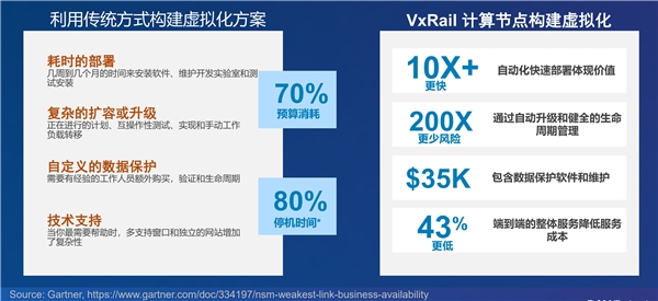 根据Gartner的评测报告,以往用户利用传统方式构建虚拟化方案,存在诸多痛点,由此造成70%的预算消耗以及80%的停机时间。这种传统的虚拟化构建方案,其缺点显而易见: