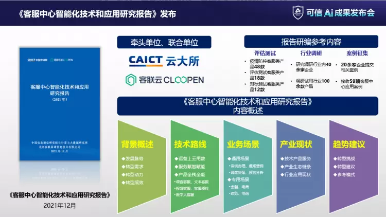 1月14日,2021可信AI成果发布会于线上顺利召开,中国信息通信研究院云计算与大数据研究所联合容联云在会上发布《客服中心智能化技术和应用研究报告》,以下简称“报告”。