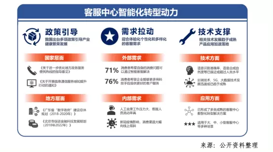 除技术支撑外,政策引导和需求拉动也是驱动客服中心智能化发展的重要源动力。