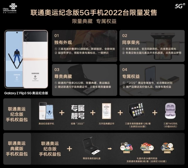 目前,中联通用户专享2022部该款奥运纪念版手机,通过联通渠道购买手机的用户还可以额外获得元宇宙典藏证书、三星冬奥限量徽章等独家冬奥权益,将这份“冬梦”珍藏心中。