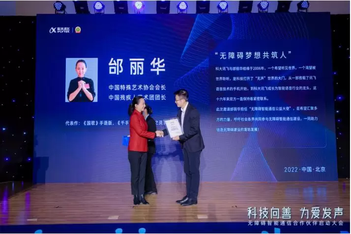 为汇聚多方力量,呼吁社会各界共同参与无障碍智能通信建设,一同助力信息无障碍建设的蓬勃发展,科大讯飞向中国残疾人艺术团团长、中国特殊艺术协会会长邰丽华女士颁发“无障碍智能通信公益大使”。科大讯飞与邰丽华结缘于2006年,一个希望听见世界,一个渴望被世界聆听,是科技打开了“无声”世界的大门。从一部搭载了讯飞语音技术的手机开始,到科大讯飞成长为智能语音行业的龙头,这十六年来双方转移至保持着紧密联系。