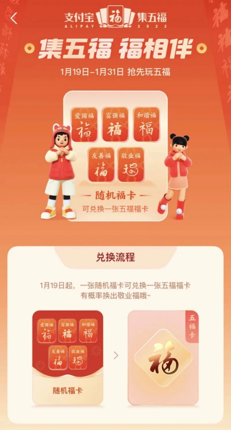 支付宝集五福活动1月19日正式开始,现可提前领福