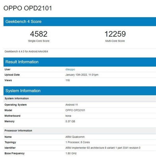 现在,OPPO的首款平板电脑现身Geekbench平台,在测试中,其搭载的骁龙870单核跑分为4582分,多核跑分为12259分。