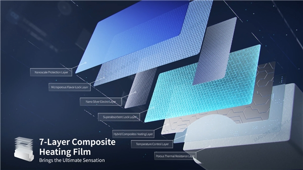 首先是材料创新,它采用行业首款七层复合加热膜,取代上一代的单层金属厚膜。七层膜各有乾坤,包括提升抗腐蚀性的宝石防护层,提升口感还原度的细胞锁鲜层,提升能效的纳米银电极层,拥有高表面张力多孔仿生结构的超吸锁液层,能够快速升温的精密合金加热层,可以辅助形成梯级温场的控温层,借鉴航天隔热瓦结构减少热量散失的多孔阻热层。七层复合加热膜带来了陶瓷芯性能的全面提升,也带来更好的减害与更高的能效。