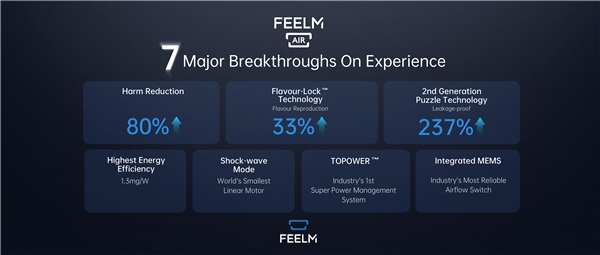 基于新一代仿生薄膜陶瓷芯的技术创新,不仅让FEELM Air实现了薄至7.8mm的业界至薄机身设计,相较上一代薄了25%。更重要的是,FEELMAir电子雾化解决方案取得革命性的突破,带来用户体验方面的七大突破。