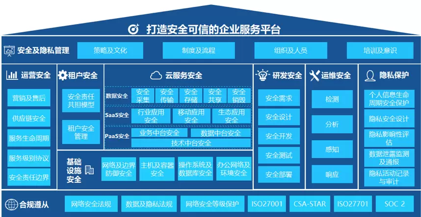 为做最值得托付的企业服务平台,金蝶一直在积极探索和构建一套完整的安全及隐私体系,确保所提供的产品是安全可信的,辅助企业应对监管要求、网络攻击和用户权益申请。金蝶认为一个完整的安全及隐私体系应包含五大维度:安全及隐私管理、产品安全(云服务安全、租户安全、基础设施安全)、产品研发/运维/运营安全、隐私保护管理、合规遵从(法律法规合规、国际/行业标准合规)。