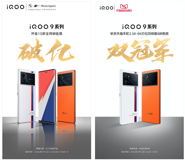 1月12日iQOO天猫超级品牌日,iQOO品牌斩获安卓手机品牌销量&销售额TOP 1、iQOO手机官方旗舰店斩获安卓手机官旗销量&销售额TOP 1,iQOO 9系列新品成绩强势登顶,斩获天猫安卓手机全价位段销量&销售额双冠军!实现了iQOO品牌销量和声量的双爆发。