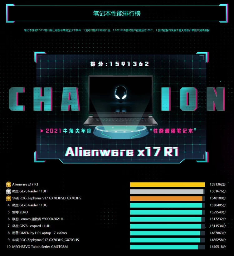 由上图笔记本性能榜可看,获得2021年鲁大师牛角尖奖性能最强笔记本是Alienware x17 R1,它以1591362分获得第一。