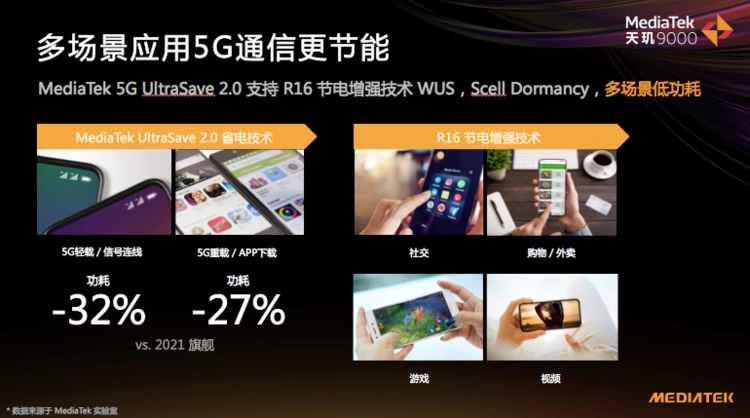 在目前旗舰市场用户更关注的功耗部分,天玑9000搭载了联发科最新的UltraSave 2.0省电技术,支持R16节电增强技术WUS、Scell Dormancy,可实现多场景下的低功耗。相比于2021年旗舰,天玑9000在5G轻载信号连线方面功耗降低了32%,而面对APP下载这样的5G重载,则能够降低27%的功耗。针对用户常用的社交、购物、游戏、视频等多场景完成功耗控制,以达到省电的目的,为用户提供更持久的手机续航。