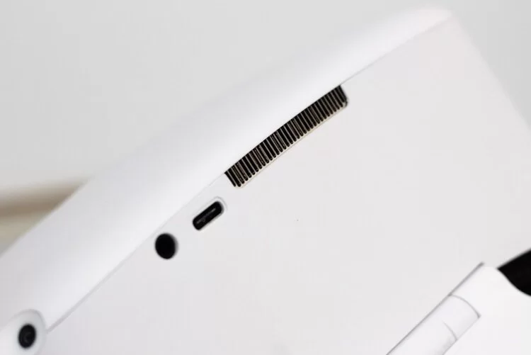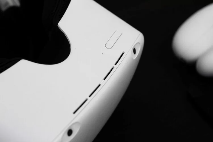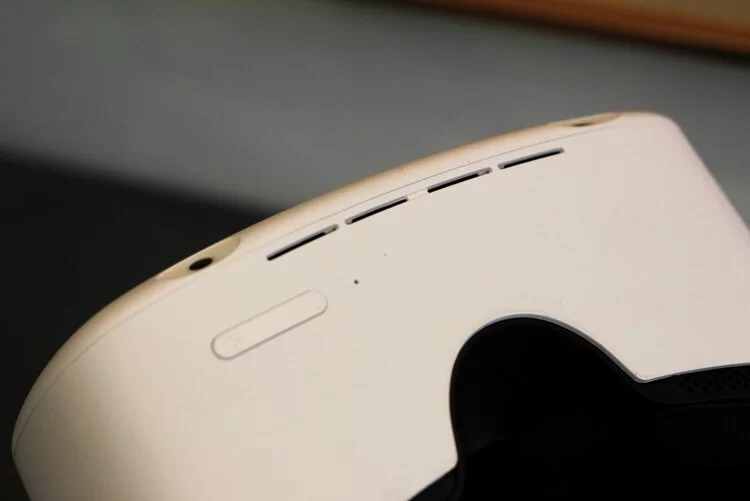 当然在VR主机中,其实你可以看到很多的细节。白色的设计除了能够让我们感觉到它设计的简约之外,也能够让我们能够感觉它设计的时尚。在顶部你可以看到散热开孔,以及旁边的Type-C口和3.5mm耳机接口。